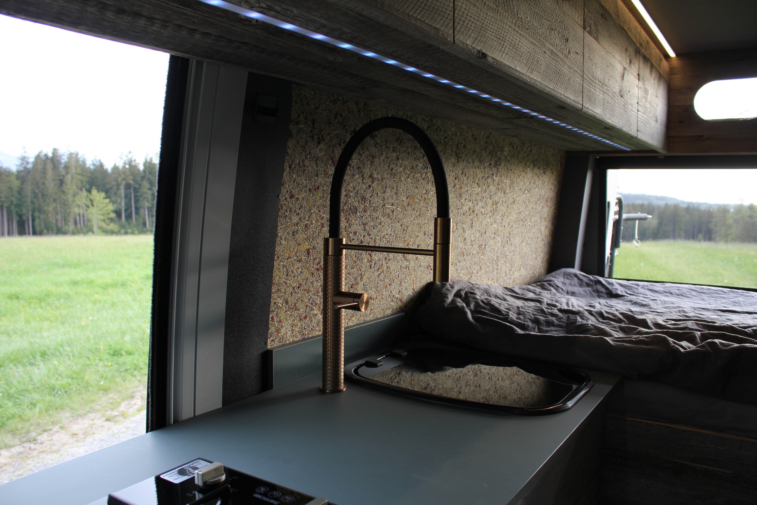 Dieser Sprinter überzeugt durch seinen hochwertigen und soliden Massivholz-Ausbau. Da der Kunde selbst auch Innenarchitekt ist, entstand hier ein außergewöhnliches Fahrzeug.